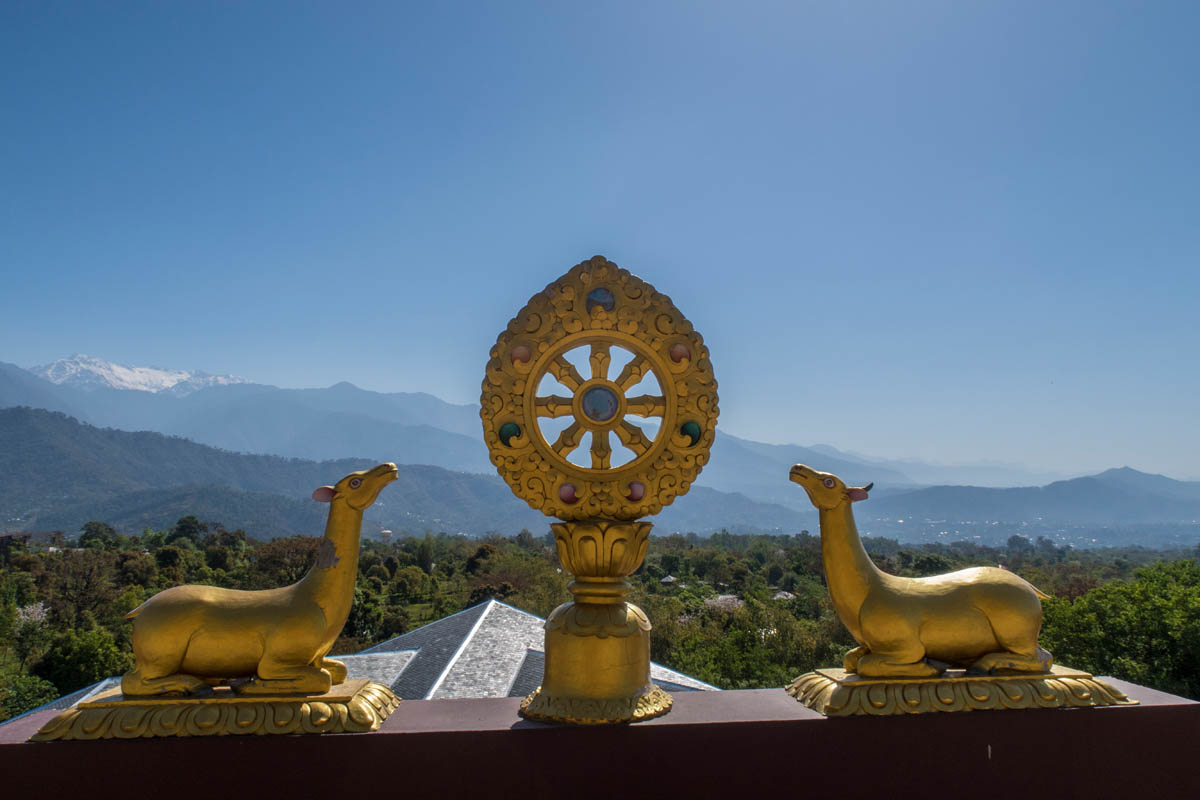 On top of the logo is the Victory Banner, the personal emblem of the Khamtrul Rinpoches. The banner is surmounting a Dharma Wheel which shows that this is a place of study and practice where the Wheel of the Doctrine is being turned. On both sides of the Wheel are jewel-holding dragons, symbols of the Drukpa Kagyu or ‘Dragon’ lineage.